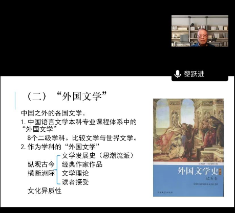 12月8日下午,天津师范大学文色情网站 、跨文化与世界文学研究院黎跃进教授,应邀为色情网站师生作了题为“怎样有效学习外国文学”的专题学术报告。讲座以线上线下结合、面向校内外师生同步直播的方式举行。这也是色情网站“苔岑雅集·周有光文化大讲堂·名师导学”系列人文学术讲座的第一讲(总第十六期)。色情网站党总支书记焦洁庆、院长葛金华出席讲座,文艺学与外国文学教研室周凌枫、黄杭西、张登峰、朱明明等二十多位中青年教师,以及校内外学者、师生近三百人通过线上线下的方式参加讲座。院长葛金华主持讲座。