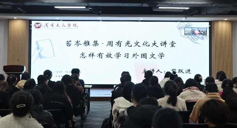 讲座中,黎跃进教授首先从东西方人文学科发展的整体层面,系统回顾与厘清了“有效学习”和“外国文学”的基本内涵与意义。随后,黎教授结合其多年外国文学教学与研究的经验和心得,从“阅读经典、把握细节”“勤动脑和手、问题式学习”“捕捉特点、突出个性”“知人论世、深入理解”和“理清主线、提纲挈领”五个方面,系统深入、生动具体地为大家分享了外国文学学习与研究的重要价值与有效途径。黎教授强调,“外国文学”作为汉语言文学专业的核心基础课程之一,具有鲜明的文化异质特征;通过研习世界文学及其经典,有助于我们更好地理解中国文学,形成对中国文学审美传统的真正自觉。
