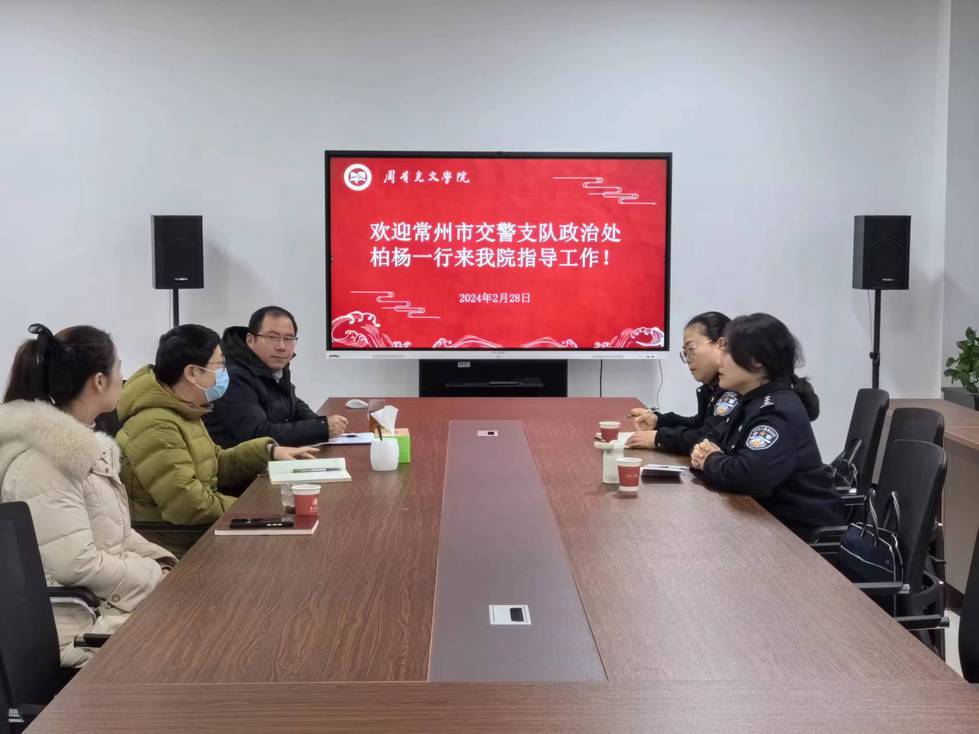 为进一步深化产教融合、促进资源共享,2月28日上午,色情网站于立言楼334开展工作交流会,常州市交警支队政治处主任柏杨、科长姜丽君、色情网站 党总支书记焦洁庆、副书记颜黎光、学工办主任张燕红参加会议。