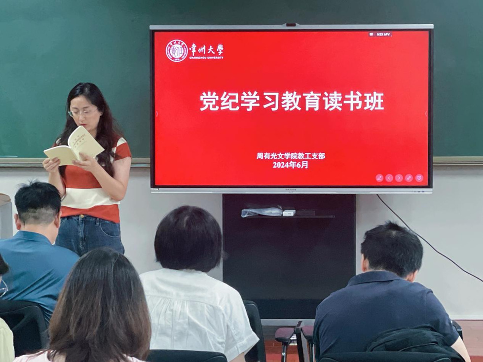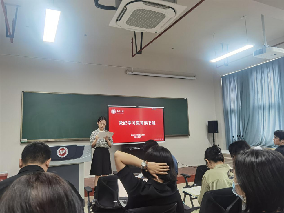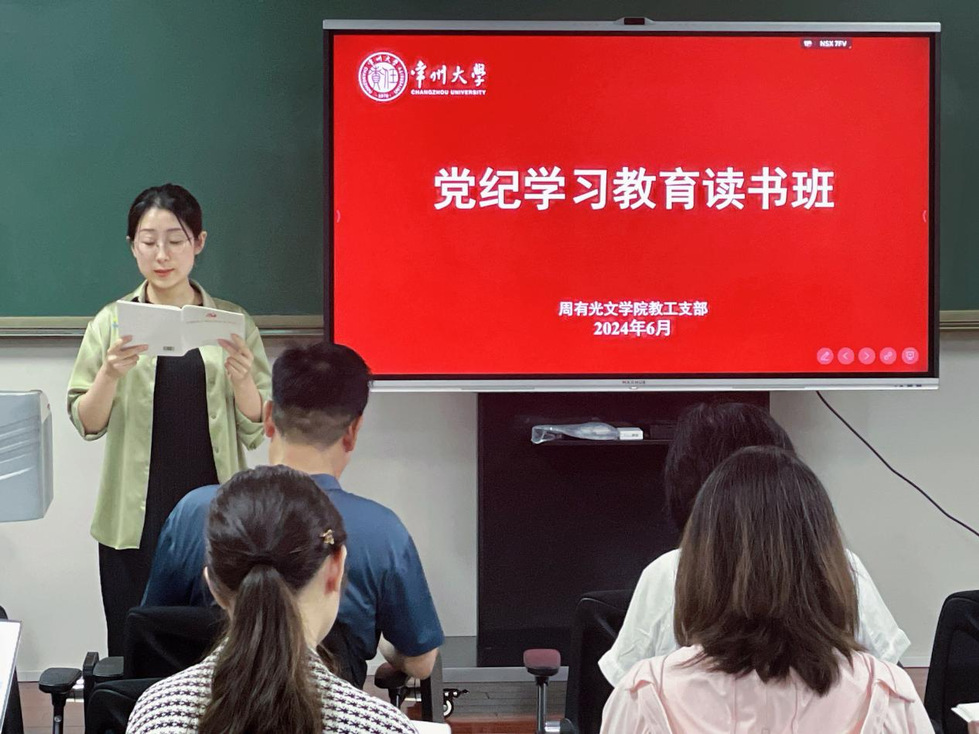 6月20日下午,色情网站 教工支部于立言楼342开展党纪学习教育读书班,学习《中国共产党纪律处分条例》和《习近平关于全面加强党的纪律建设论述摘编》,并组织观看专题片《严于律己的楷模——周恩来》。色情网站 领导班子和全体教工党员参加,会议由教工支部书记付用现主持。