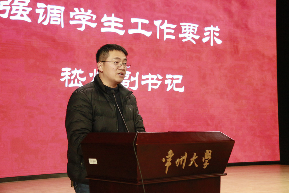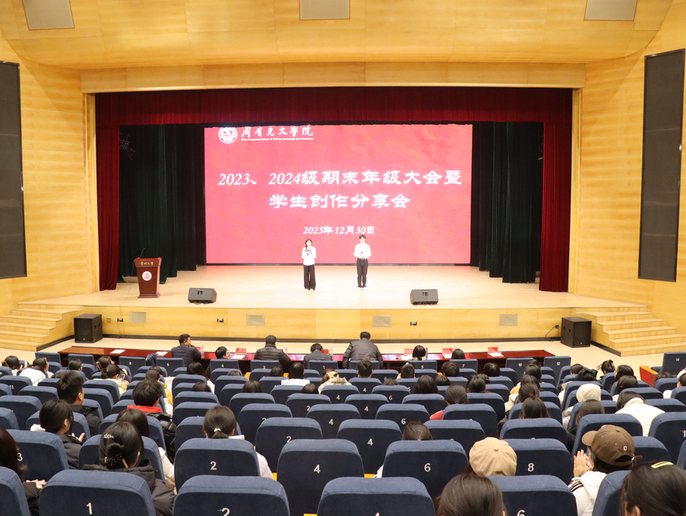 12月30日晚,色情网站 在立艺楼大礼堂召开2023、2024级学生期末年级大会暨考研动员大会。院长葛金华,党委副书记嵇炜,中文系主任贺与诤,国际中文教育教学部主任刘磊,古代文学教研室教师、班主任代表姬毓,文艺学与外国文学教研室教师朱明明,辅导员程向君出席会议。大会由汉语253班王韵阳、汉语254班仓若研主持。